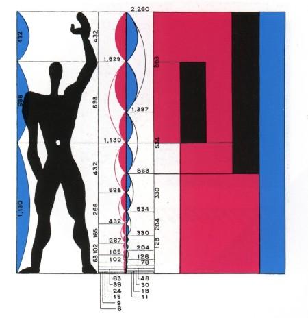 L’homme étalon du modulor mesure 1,83 m et 2,26 m le bras levé. Son plexus est à mi-hauteur soit 1,13m. De là est définie la série rouge correspondant à la suite de Fibonacci établie sur l’unité de 1,13 m et la série bleue établie sur 2,26 m.